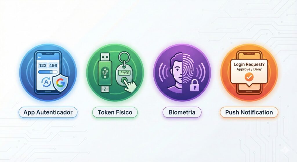 - Priorizar tokens de hardware e biometria: Mais seguros do que SMS e e-mail, que são vulneráveis a phishing e SIM swapping.