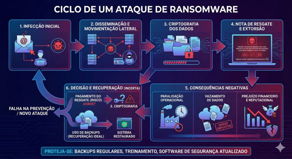 - Criptografia de dados e extorsão dupla/tripla: Além de bloquear o acesso, ameaçam vazar informações sensíveis e pressionam por resgates sob risco de sanções regulatórias e danos reputacionais.