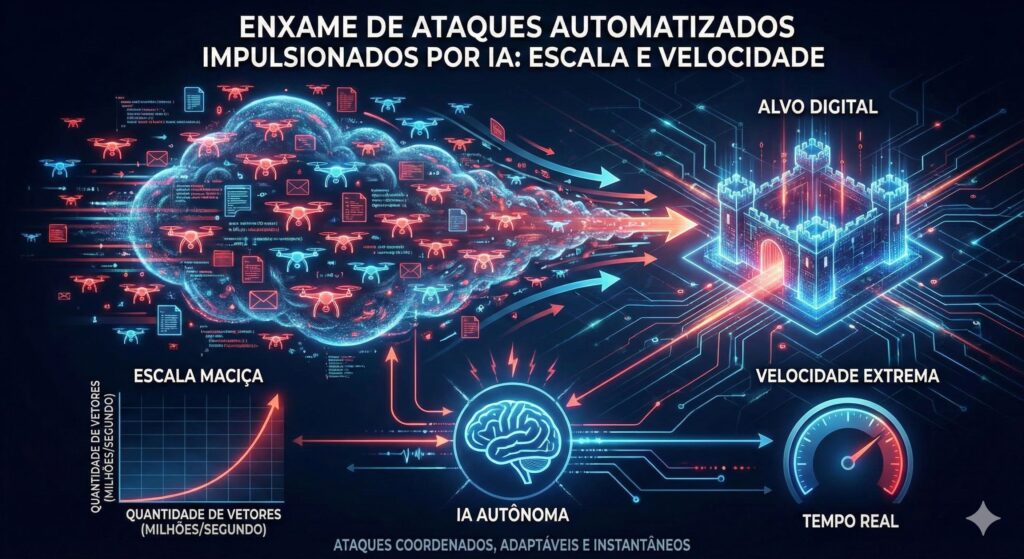 - Enxames de ataques automatizados: Agentes de IA capazes de disparar milhares de e-mails de phishing por segundo, criar ataques de dia zero e implantar ransomware em larga escala.