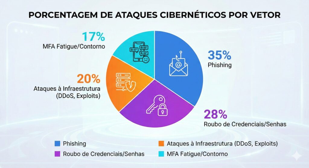 O roubo e abuso de identidades digitais é o “calcanhar de Aquiles” das organizações em 2026. Segundo o IBM X-Force, 71% dos ataques globais exploram identidades fracas ou roubadas. No Brasil, incidentes baseados em identidade cresceram 32% apenas no primeiro semestre de 2025.