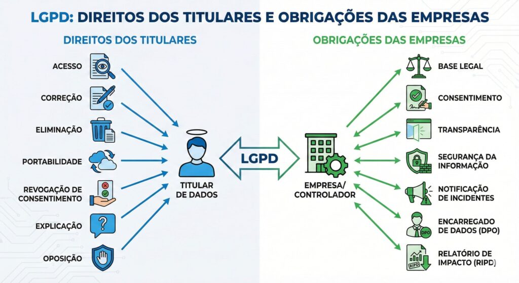 A LGPD estabelece dez princípios fundamentais para o tratamento de dados, incluindo finalidade, necessidade, transparência, segurança e responsabilização. Toda empresa que coleta, armazena ou processa dados pessoais deve: