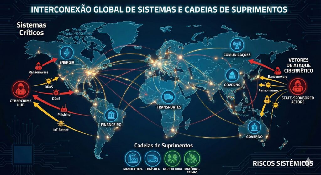 A infraestrutura crítica (energia, água, saúde, transportes, finanças) está cada vez mais exposta a ataques cibernéticos, com potencial de causar efeitos em cascata e comprometer a segurança nacional. O Relatório Global de Riscos 2026 do Fórum Econômico Mundial coloca a cibersegurança entre os dez maiores riscos da próxima década.