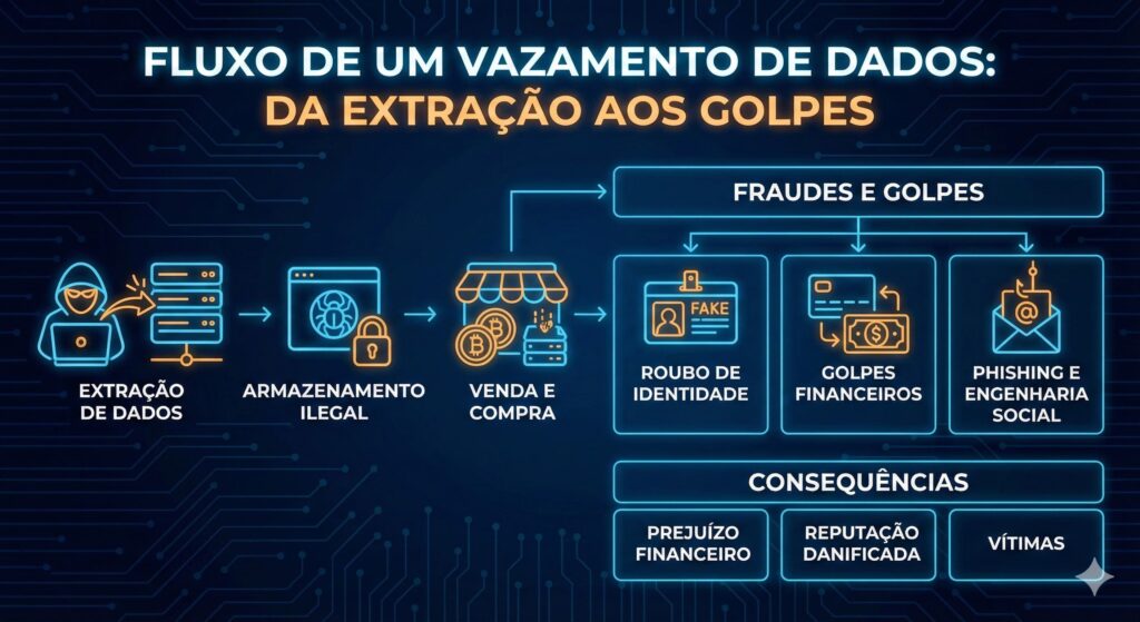 - Recirculação de bases de dados: Informações vazadas são revendidas e reutilizadas em novos ataques, ampliando o risco para empresas e cidadãos.