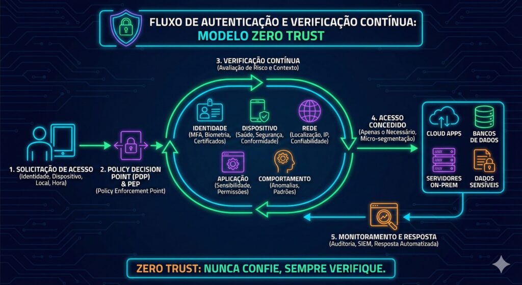 O modelo Zero Trust (confiança zero) parte do princípio de que nenhum usuário, dispositivo ou aplicação é confiável por padrão, mesmo dentro da rede corporativa. Cada acesso deve ser continuamente verificado, com privilégios mínimos e monitoramento constante.